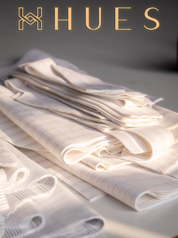 At HUES, every detail matters. We cut fabric precisely, align patterns perfectly, and use single-needle seams with 12-16 stitches per inch for a flawless finish. Our interlinings keep collars and cuffs structured, while securely wrapped buttons ensure lasting durability.