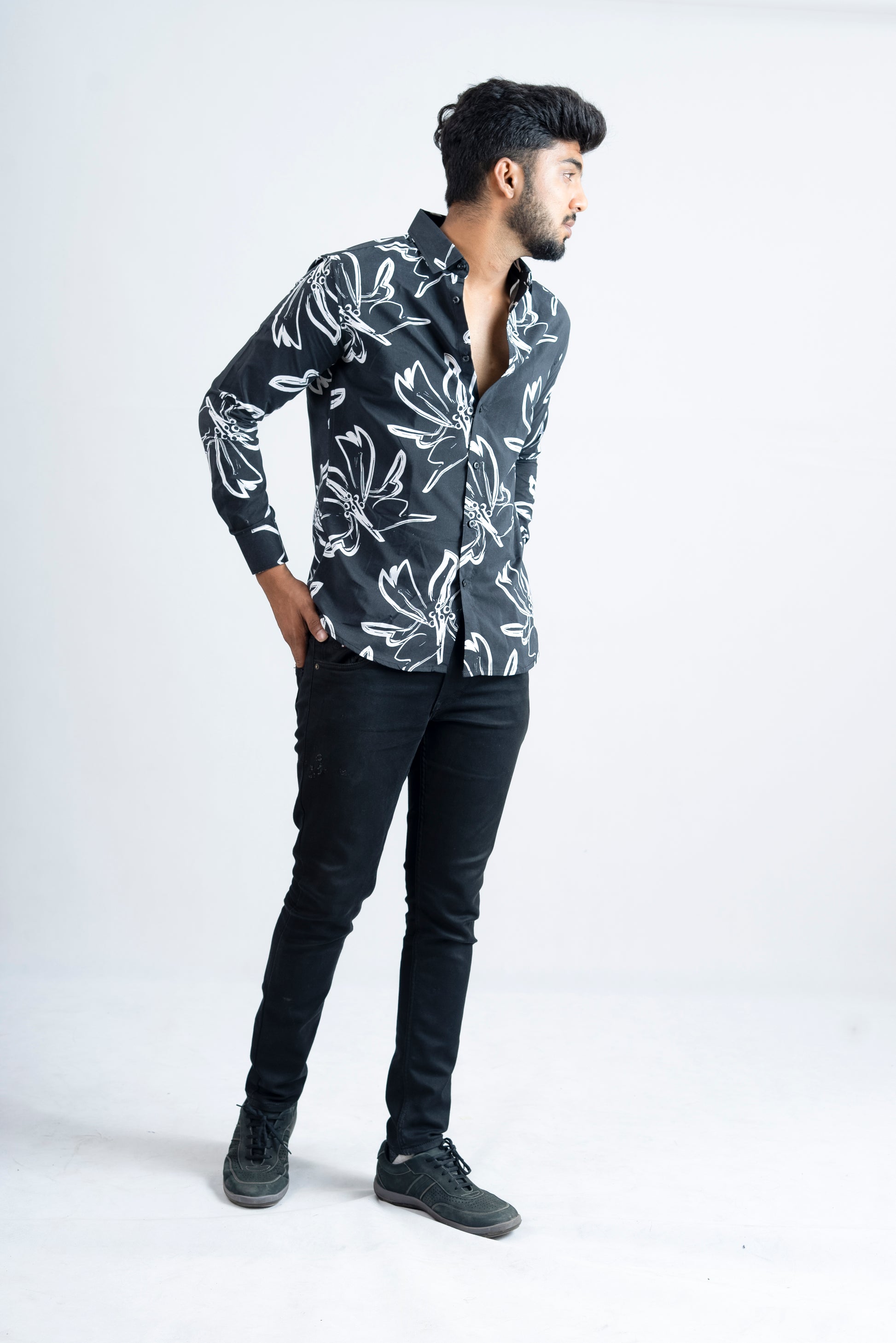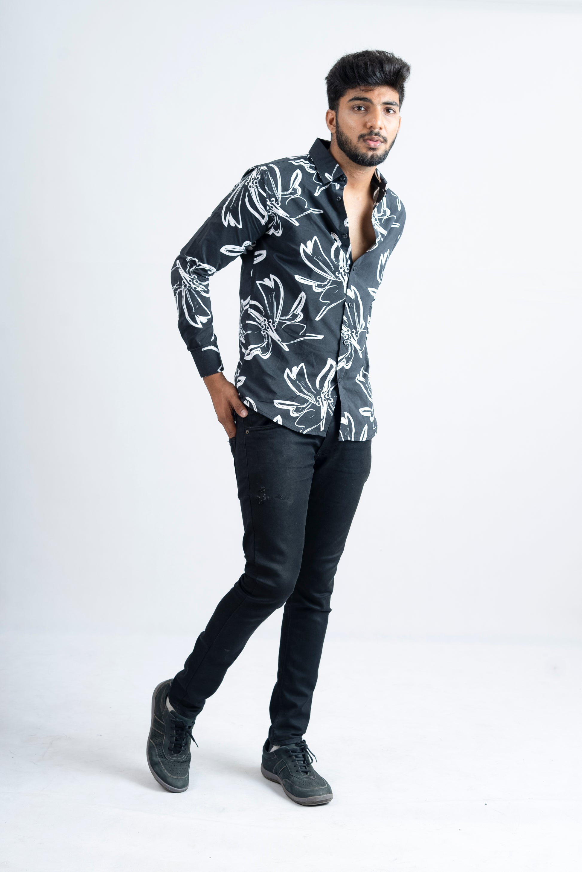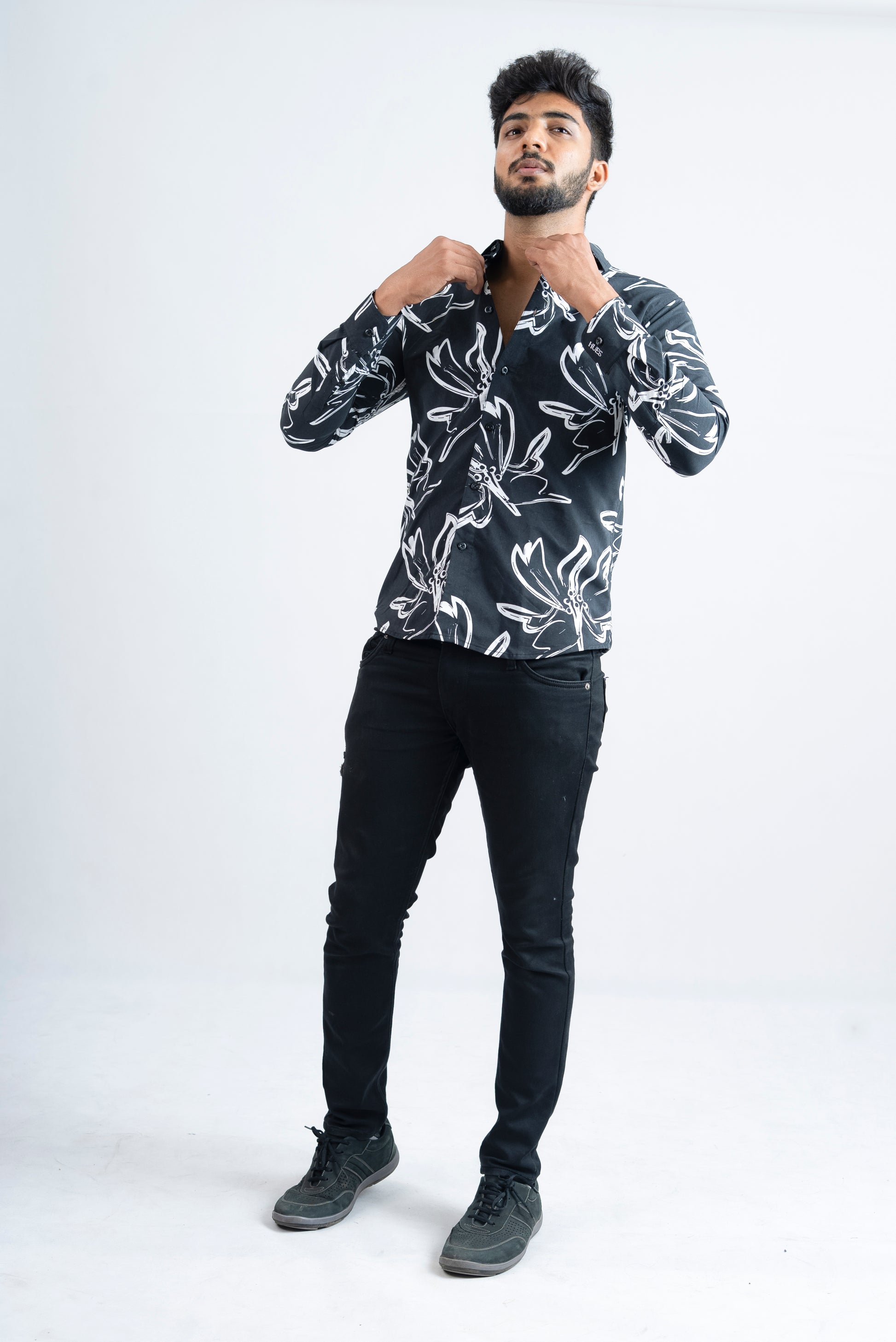 Own the night with this black floral printed full-sleeve shirt. Moody, bold, and effortlessly stylish, it brings just the right mix of edge and elegance. Perfect for late-night plans, rooftop vibes, or whenever you feel like making a statement.